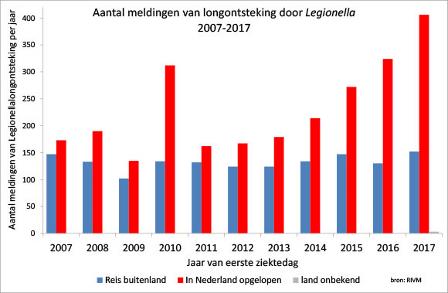 Het totaal aantal meldingen van legionellalongontsteking per jaar. |