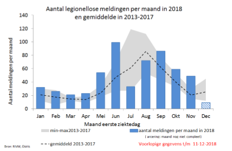 Aantal legionellosemeldingen in het lopende jaar en het gemiddelde aantal meldingen in de voorgaande vijf jaar (2013-2017). |